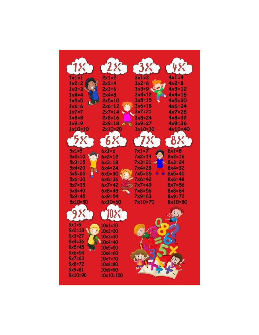 Décoratif et éducatif à la fois, ce tapis "Table de Multiplication" a tout pour plaire!Ces tapis sont fabriqués en polyester, doux au toucher, ce qui le rend très facile à nettoyer, même sur les taches les plus tenaces. Tapis antidérapant et lavable en machine à 30°C.Poids : 720gr/m2Epaisseur : 6mmDisponible en 2 tailles :- 100x160cm- 120x180cmNos tapis étant fabriqués à la machine, un écart de plus ou moins 3 cm peut être constaté.Il ne s'agit pas d'un défaut de fabrication, ce que le client admet et reconnait.